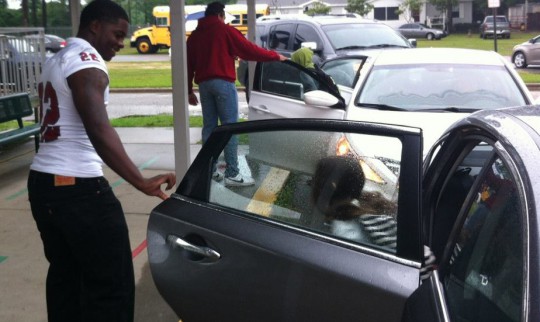 Several members of the Tate High School football team were up early Friday morning to volunteer in the car rider lines at several elementary schools. The players welcomed the students to school. Photos for NorthEscambia.com, click to enlarge.