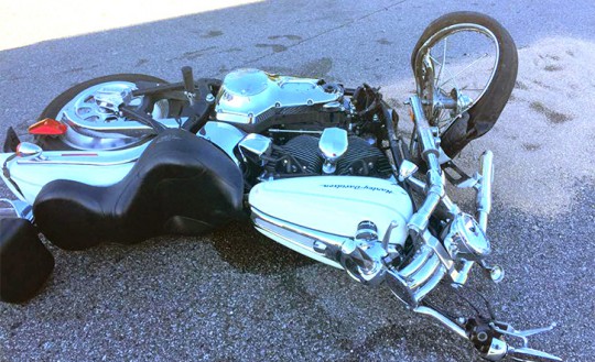 The collision between the Harley Davidson motorcycle and a car happened about 5:40 at Pine Forest and East Kingsfield Road.