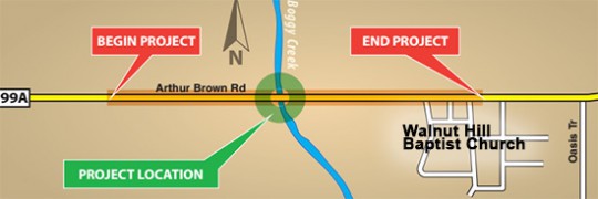 Construction activities will begin next week to replace the Arthur Brown Road bridge over Boggy Creek, near the Walnut Hill Baptist Church.