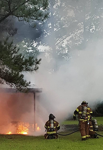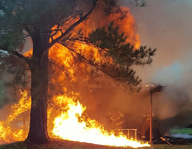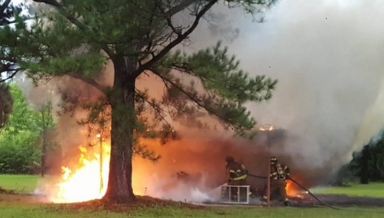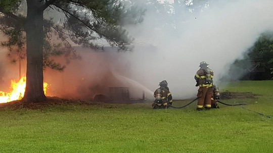 A fire possibly sparked by lightning destroyed large outdoor shed in the 8400 block of Upper Creek Road near Flomaton Thusday afternoon. Firefighters were hampered in their efforts to extinguish the fire by fuel that was stored inside. They turned to foam to eventually put out the fire. The Flomaton, Friendship, Barnett Crossroads fire departments, the the McDavid and Century stations of Escambia Fire Rescue, Escambia County (FL) EMS and the Escambia County (AL) Sheriff’s Office all responded to the fire. There were no injuries reported. Photos by April McCullough for NorthEscambia.com, click to enlarge.