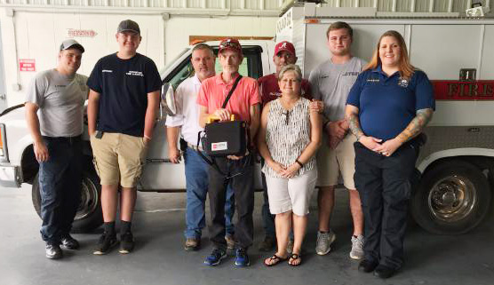 Pictured: Artie Bell (center, holding defibrillator bag) stopped by the Flomaton Fire Department Tuesday to thank them for saving his life. Photo for NorthEscambia.com, click to enlarge.