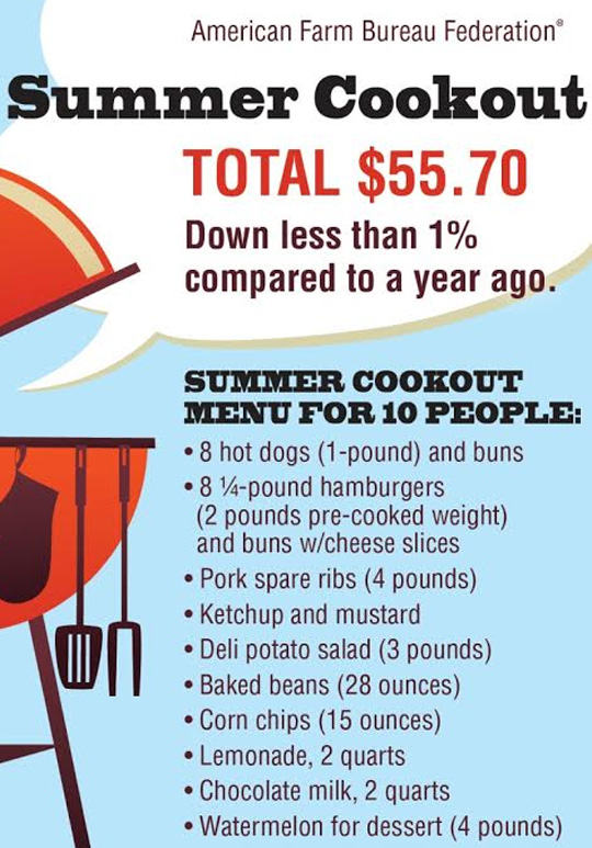 Farm Bureau’s informal survey reveals the average cost of a summer cookout for 10 people is $55.70, or $5.57 per person. The cost for the cookout is down slightly (less than 1 percent) from last year.