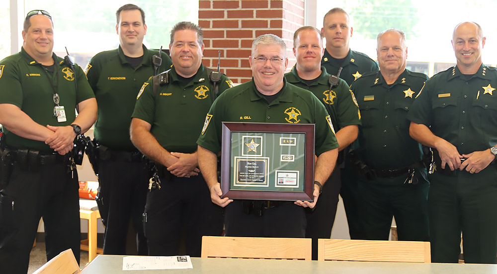Pictured top. Now retired Florida School Resource Office of the Year Ronnie Gill (center), Chief Deputy Chip Simmons (right) and a group of school resource officers at Ernest Ward Middle School. NorthEcambia.com file photo, click to enlarge.