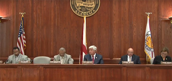 Pictured top: Provalus/Optomi President Chuck Ruggiero addresses the Brewton City Council (pictured below). Images for NorthEscambia.com, click to enlarge.
