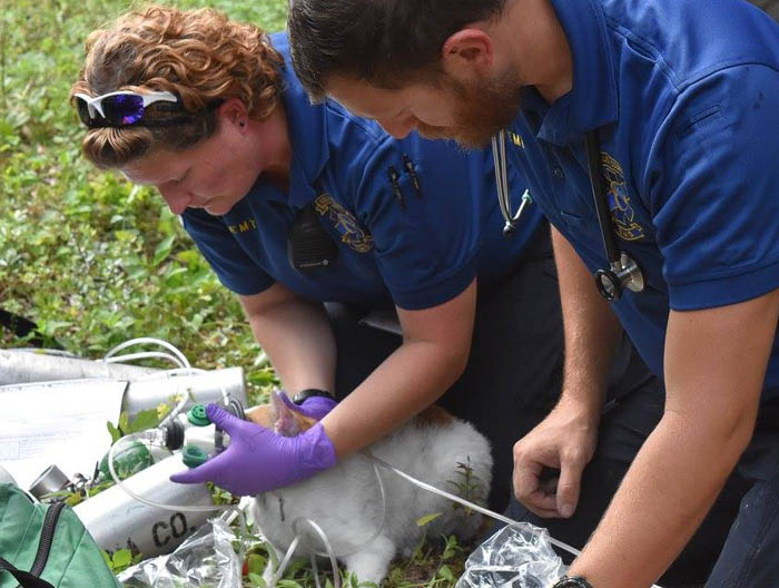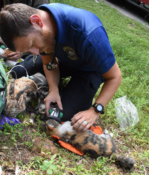 There were 14 family pets in the house — one rabbit, four dogs and nine cats. The rabbit and five cats survived the fire as firemen and EMS using pet oxygen masks to help save them.