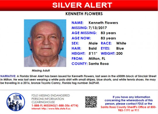 Kenneth Flowers, 83, was last seen in the 6500 block of Sinclair Street in Milton. He was last seen wearing a white polo shirt with small stripes, blue shorts and white tennis shoes. He may be traveling in a 2016 Toyota Camry with Florida tag 362PAR.