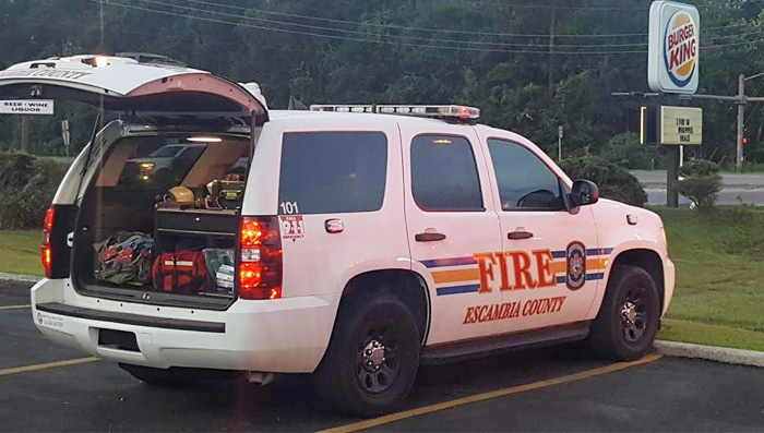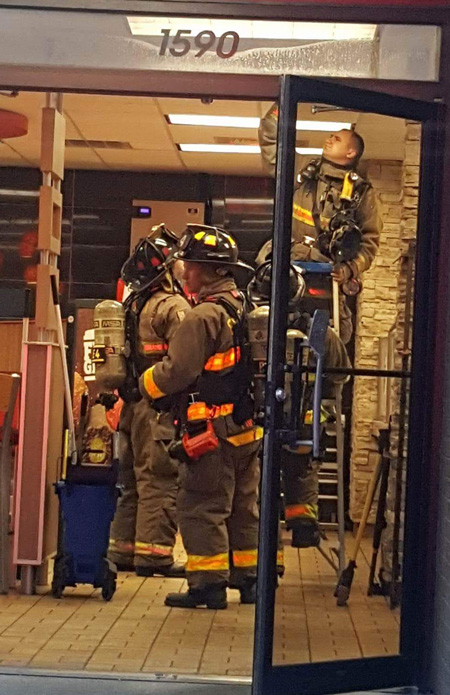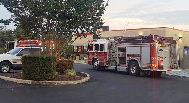 Firefighters responded to the smell of smoke in the Burger King restaurant on Highway 29 at Old Chemstrand Road early Wednesday morning. Employees reported a burning smell in the ceiling. The odor was traced to a malfunctioning air conditioning unit. There was no damage reported. NorthEscambia.com photos by Kristi Barbour, click to enlarge.