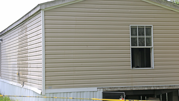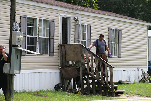 Pictured above and below: A man pulled from a fire in this mobile home was later pronounced deceased at Jay Hospital Tuesday afternoon. Pictured inset: Flomaton PoliceĀ enter the mobile home for their portion of the death investigation. NorthEscambia.com photos, click to enlarge.