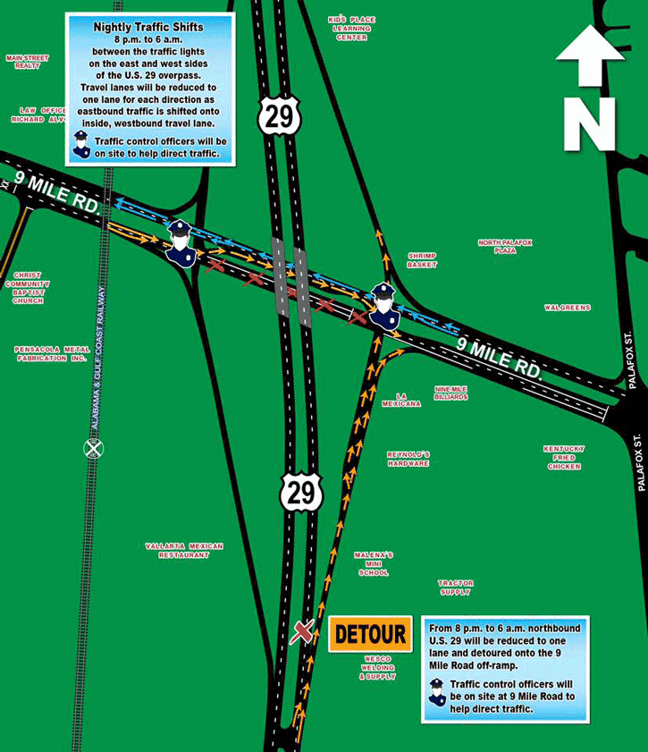 Tonight, drivers traveling Highway 29 and Nine Mile Road in Escambia County will experience changes in traffic patterns from 8 p.m. to 6 a.m. as crews continue preparations for bridge work and drainage improvements. Traffic control officers will be on site to help direct traffic.