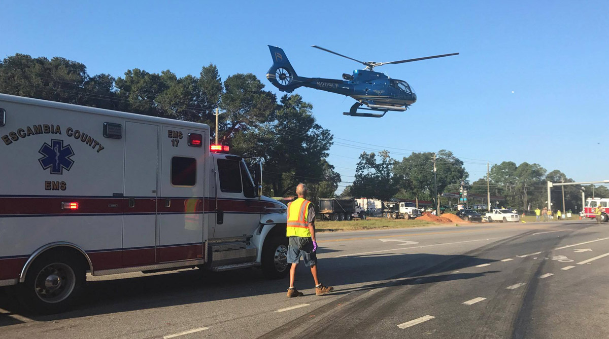 Grissom and his passenger, 45-year old James Rafferty, were seriously injured. Rafferty was airlifted by LifeFlight helicopter to Baptist Hospital, while Grissom was transported by Escambia County EMS to Sacred Heart Hospital.