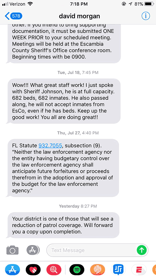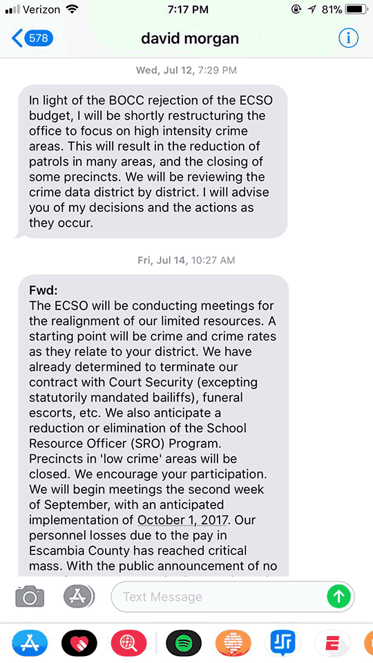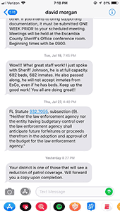 Less than two hours after the Escambia County Commission passed a budget short of the demands made by Escambia County Sheriff David Morgan, the sheriff texted at least three commissioners letting them know that patrols would be reduced in their district.