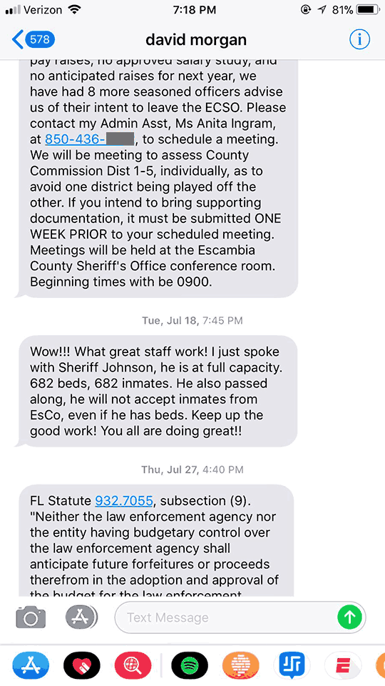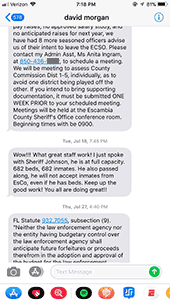 Pictured top: Screenshot from a Tuesday night text from Escambia County Sheriff David Morgan to Escambia County Commissioner Stephen Barry. Pictured below: Screenshots of texts Barry received during the summer from Morgan. Barry said he did not reply to any of the texts. Click any image to enlarge.