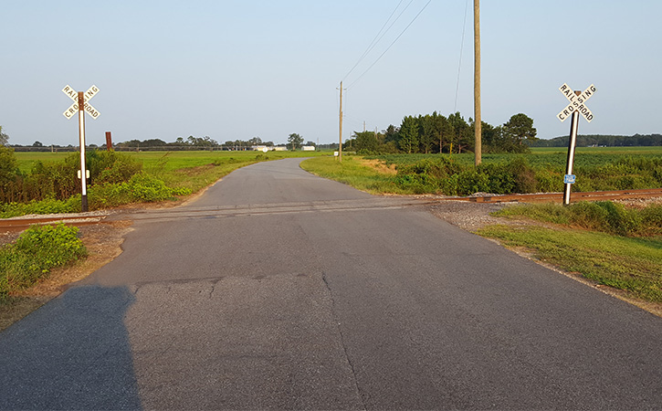 Pictured top: The Alabama & Gulf Coast Railway railroad crossing on Nokomis Road. NorthEscambia.com photo, click to enlarge.