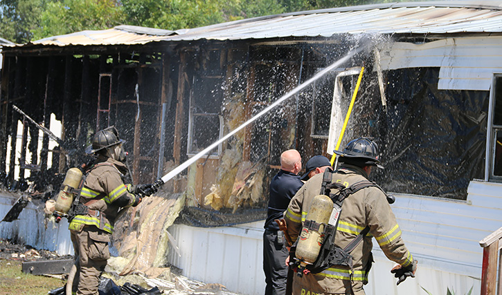 Pictured: Atmore firefighters extinguish a re-flash Monday afternoon at an Atmore mobile home. NorthEscambia.com photos, click to enlarge.