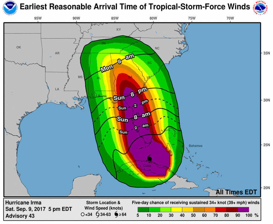- Irma is expected to make landfall in Florida as an extremely dangerous major hurricane, bringing life-threatening wind impacts to much of the state. Wind hazards from Irma are also expected to spread northward along the coast of Georgia and South Carolina. The most significant impacts associated with Irma are expected to remain east of our area through early next week. Breezy northeasterly to northerly winds will be likely, especially Monday and Monday night.