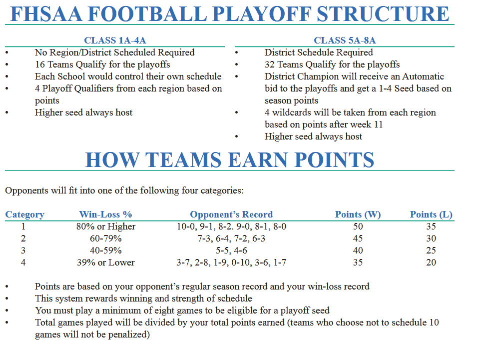 The Florida High School Athletic Association has released current projected football playoff points to date for local high school teams.