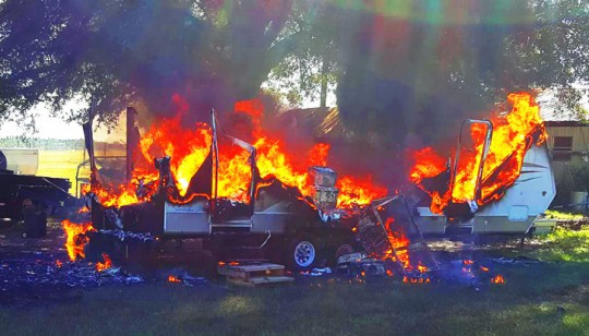 Yikes… looks like a pretty new camper trailer. Unfortunately, wood, plastic, fiberglass, and rubber (roof) burn like crazy.