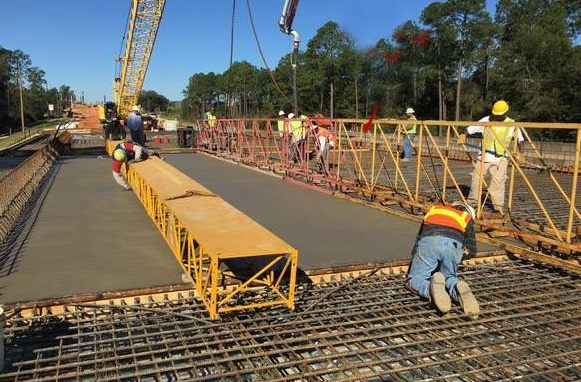 The “screed” moves back and forth to strike off the wet concrete to a smooth and uniform surface. Crew members ensure a uniform head, which is slightly above the finished surface, of the wet concrete is consolidated as the screed moves forward. Next, crews use a work platform to hand finish any small imperfections and ensure a uniform finish.