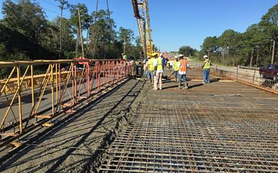 Pictured bottom, wet concrete is pumped from the concrete delivery truck using a specialty pump truck to the new bridge deck. Crew members consolidate the concrete into the deck forms with concrete vibrators.