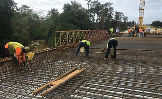 Pictured below, construction workers are tying reinforcing steel, also known as “rebar”, for the bridge deck. The concrete will be placed once all the reinforcing steel has been installed. The reinforcing steel is good in tension and the concrete is good in compression and together they make for a strong bridge deck.
