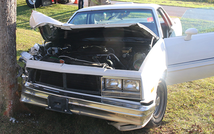 An elderly driver received only minor injuries when he crashed a classic Chevrolet ElCamino into a tree Tuesday morning in Bratt.