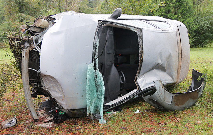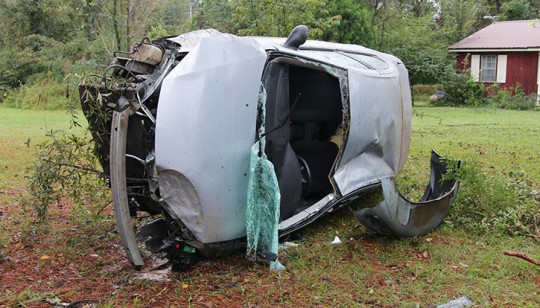 The accident happened about 8:15 a.m. on Highway 29 at Driver Road. The female driver of a Dodge Stratus lost control while southbound on Highway 29 when she left the roadway, struck a utility pole and large bush before overturning in a resident’s yard.