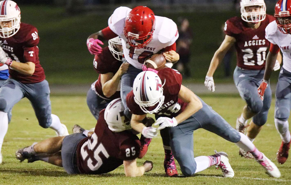 Pine Forest took a 7-0 lead with 7:37 to go in the first quarter, but the Aggies answered less than 30 second later. Tate made it 7-7 on a 75-yard run from junior Hunter Riggan .
