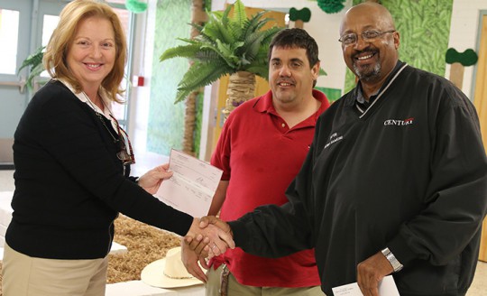 Pictured top: Century Academy director Barbara Barber accepts a $500 check from Century Mayor Henry Hawkins (right) as Jake Livingston looks on Wednesday morning. NorthEscambia.com photos, click to enlarge.