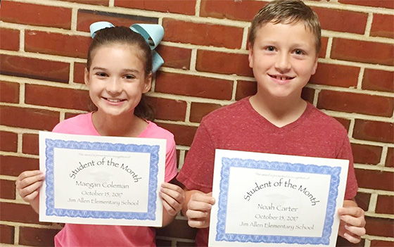 Jim Allen Elementary School has named Students of the Month for October. They are Maegan Coleman (left) and Eli Langreck. Courtesy photo for NorthEscambia.com, click to enlarge.