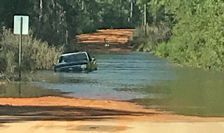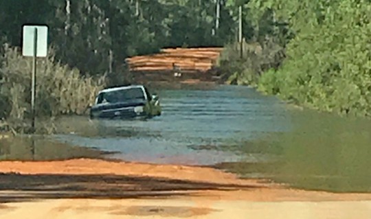 Pictured top: A truck was partially submerged Monday in floodwaters on O.C. Phillips Road. Pictured below: Another view of the flooding (after the truck was removed). NorthEscambia.com reader submitted photos, click to enlarge.
