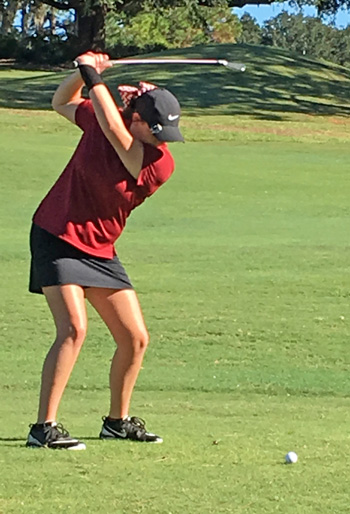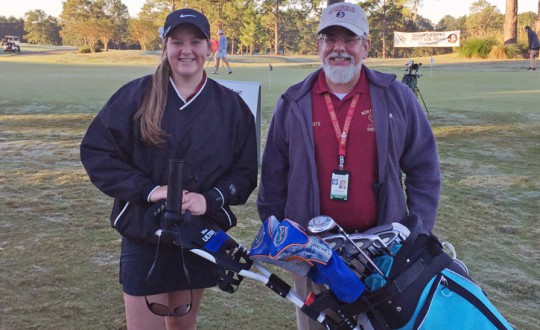 Pictured top: Northview golfer Emily Boutwell with Coach James Moretz Tuesday at the Region 1-1A Tournament in Tallahassee. Pictured inset: Boutwell swings during tournament play. Photos for NorthEscambia.com, click to enlarge.