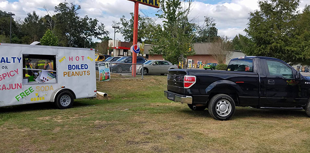 A pickup truck ran off Highway 29 and struck a peanut vendor’s trailer Friday afternoon.