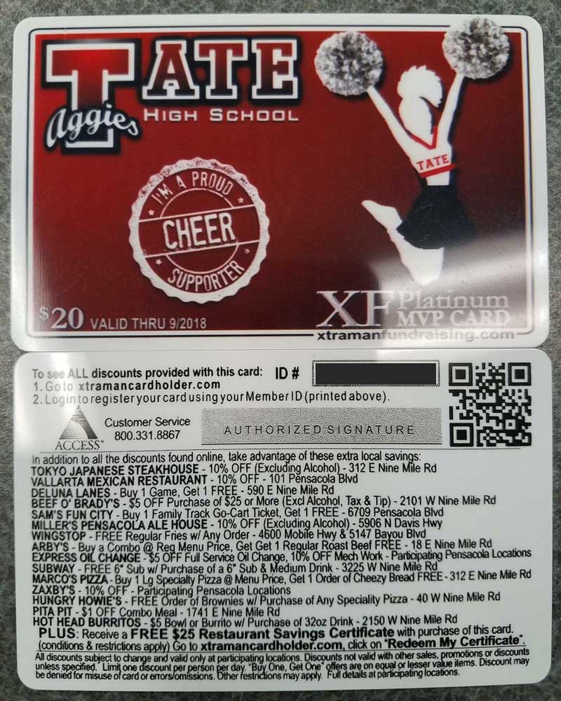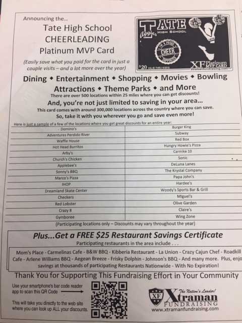 The Tate High School Aggie Cheerleaders are currently selling business discount cards for $20.