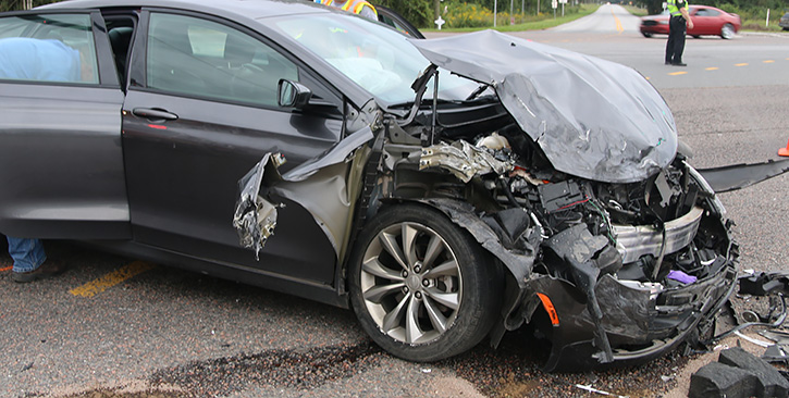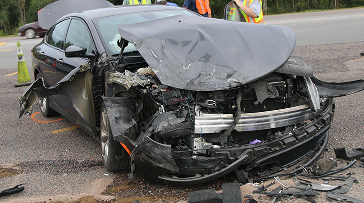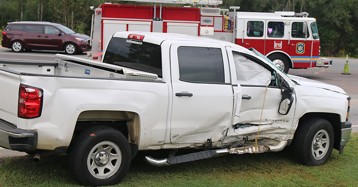 The collision involved a car and pickup; the pickup truck rolled over before coming to rest upright.