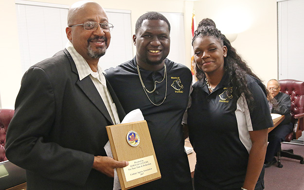 Monday night, Century Sports Association President Amanuel Dubose thanked the Century Town Council and Mayor Henry Hawkins for their support during their fall season. Dubose and sports association secretary Alicia Harris presented the town with an appreciation award.