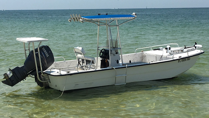The boat was a white, 20-foot center console Caroline Skiff with blue T-top and poling platform above the transom, a 100 HP, 4-strike Yamaha and a single axle galvanized trailer. The registration number on the front of the hull is FL0958MD.