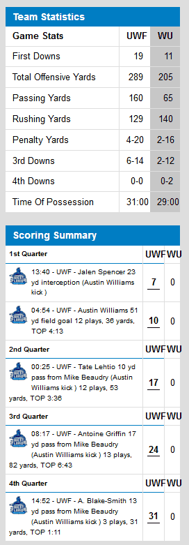 UWF (8-3) ended with 289 yards of total offense –129 on the ground and 160 through the air. Mike Beaudry was 18-for-31 with three passing touchdowns and an interception.
