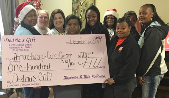 Local charity Dedria’s Gift presented Christmas donations Saturday to the residents of Westgate Village in Brewton , the Atmore Nursing Care Center and Century Health and Rehabilitation Center.