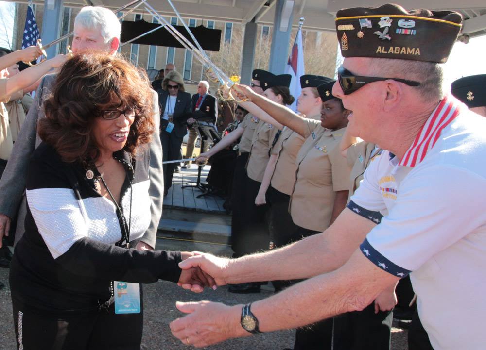 Pictured top: Florida Congressman Corrine Brown spoke in favor of an Amtrak return to the Gulf Coast during an Amtrak inspection train stop in Atmore last year. Pictured inset: Brown shakes the hand of a veteran at the Atmore Amtrak event after walking through a sword arch provided by the Northview High School NJROTC. NorthEscambia.com photos, click to enlarge.