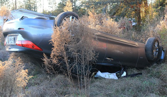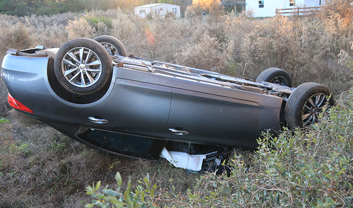 The driver of an Infiniti lost control while westbound on Salter’s Lake Road, about one-third of a mile east of Highway 29 when he lost control, ran off the dirt road and overturned. The driver reportedly told authorities he swerved to avoid a dog, and a small dog was observed in the roadway following the crash.