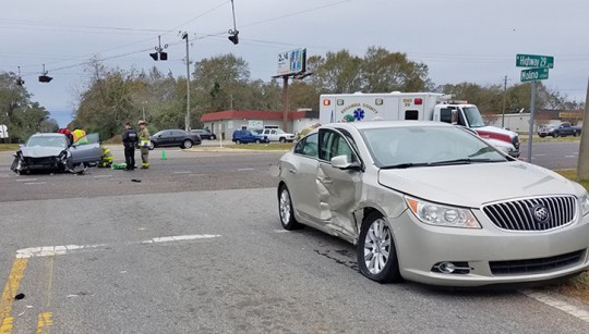 Two people were injured in a Thursday morning accident at Highway 29 and Molino Road. Both were transported to Pensacola hospitals with injuries that were not considered life threatening. The 8:45 a.m. accident briefly shut down northbound Highway 29. Further details have not been released as the Florida Highway Patrol continues their investigation. NorthEscambia.com photos by Kristi Barbour, click to enlarge.