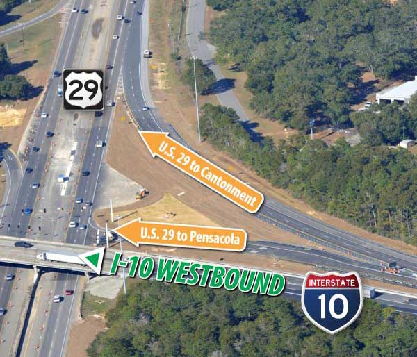 Above: Now, the team is preparing the new Exit 10 (I-10 westbound to U.S. 29 north and south) for its “grand opening.” Once opened, drivers on I-10 westbound destined for U.S. 29 north (Cantonment) and south (Pensacola) will use the new Exit 10 (where the current Exit 10B to Cantonment is located).