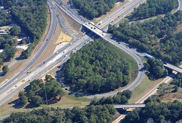 Above: A view of I-10 eastbound near U.S. 29 in Pensacola, the team completed the new wider I-10 eastbound bridge (center) and wider roadway last fall. Since then, the left-hand merge from U.S. 29 south to I-10 eastbound has been eliminated. Drivers now have a standard right-side merge from U.S. 29 north to I-10 eastbound.
