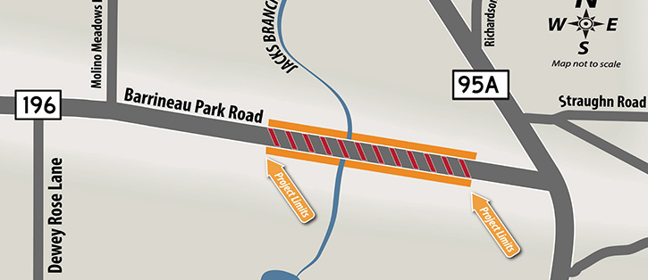 Construction activities are scheduled to begin the week of January 22, 2018 on Barrineau Park Road (Hwy. 196) over Jacks Branch in Escambia County. Crews will remove and replace the bridge over Jacks Branch, add new guardrail, and reconstruct the approach slabs.