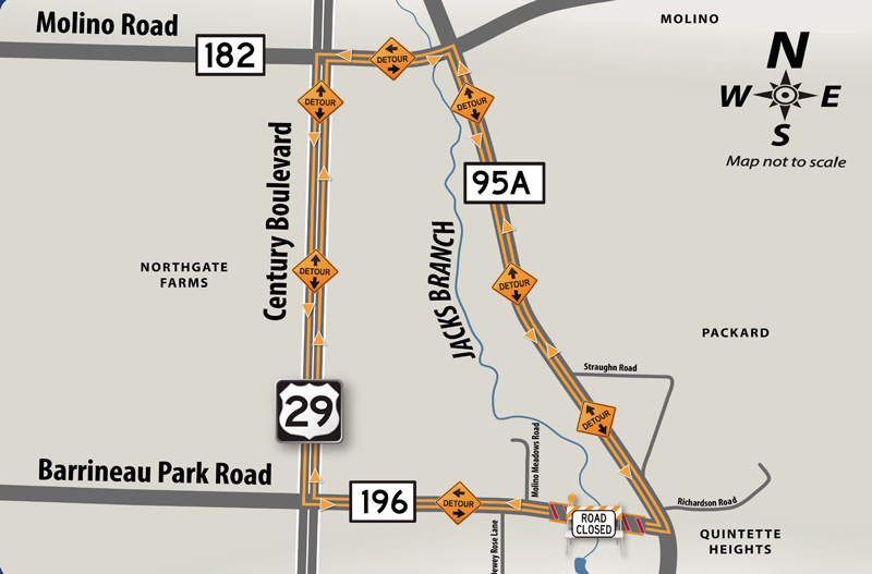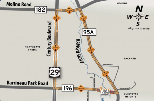Barrineau Park Road will be closed and traffic detoured via Highway 29, Molino Road (Hwy. 182), and Highway 95A. The $1.97 million project is anticipated to be completed in the fall of 2018.