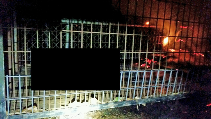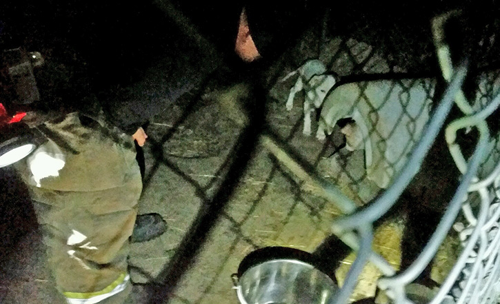 Pictured top: Fire claimed the life of a dog and three puppies in Cantonment Monday night. Pictured below: Photos show the cage were a dog and three puppies died Monday night in Cantonment. Pictured bottom: Firefighters provide water to several remaining puppies. Reader submitted photos, click to enlarge.