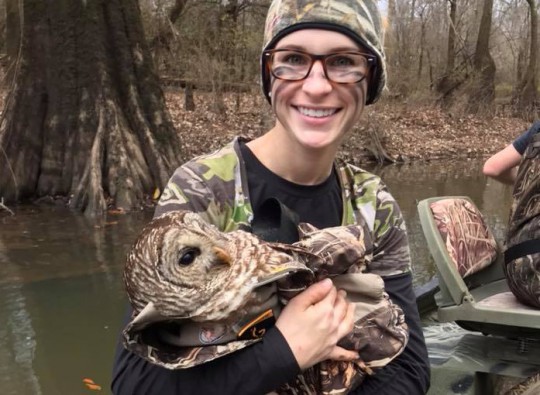 Ben Preston, David Preston, Ross Daughdrill, Lakelynn Parker and Tammy Parker were hunting when Ben Preston went out to retrieve a duck that had fallen into a wooded area. He came upon the owl hanging from the fishing line. They covered the owl with a bag while the fishing line was cut. Ben and Lakelynn wrapped the owl in Ben’s jacket and put him in their boat.