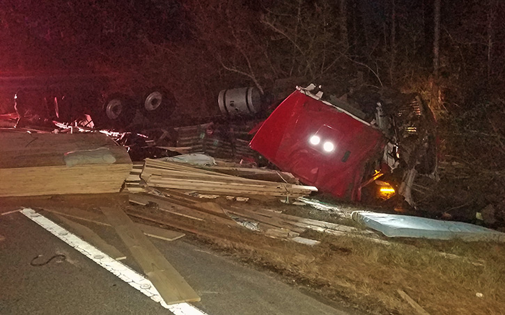 An overturned lumber truck closed Highway 90 in Beulah Monday night.