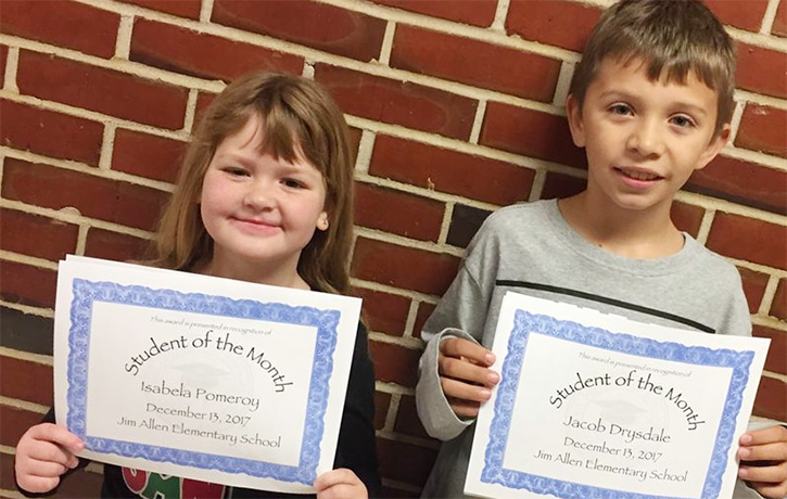 Jim Allen Elementary School has named Students of the Month for December. They are Isabela Pomeroy (left) and Jacob Drysdale. Courtesy photo for NorthEscambia.com, click to enlarge.