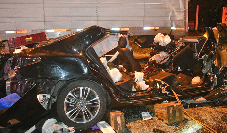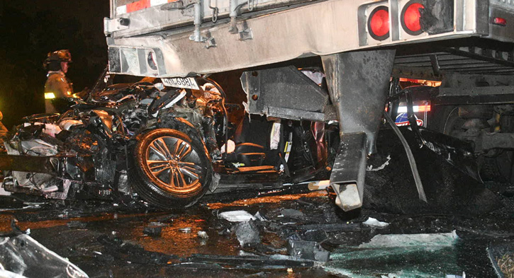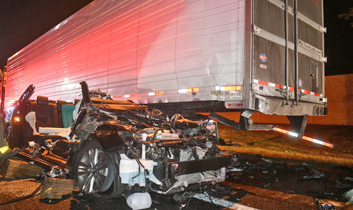 From the pictures it looks like the 18 wheeler was stopped of the edge of the road and the black car ran into the back of it.